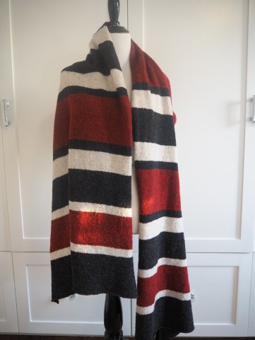 I’ve recently become totally obsessed with Brooklyn Tweed’s Loft, so the idea of knitting up Rivage became irresistible. Big blocks of stripes running throughout this blanket sized wrap sounded like the most comfortable thing I could carry around with me. I chose the colors Fossil, Cast Iron and Long Johns because I wanted to suggest the aesthetic of Navajo rugs and blankets. This piece is all stockinette stitch, so I knit it while I was mentally engaged in other activities, whether it be an intense movie (I watched Bladerunner 2049 at least 10 times in the past year), listened to some audio books, or just hung out with family. I loved keeping my hands busy while being involved in other interesting things around me.
