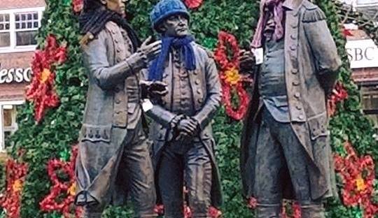 Last, there were the Morristown Fiber Fairies. We got a call last week, presumably from one of the fairies, asking for volunteer knitters to make hats and scarves for the homeless population in Morris County. This clandestine organization decks out the statues in the Morristown Green with hats and scarves throughout the cold-weather months. While it’s fun that the Fiber Fairies keep their identities a secret (what’s better than a mystery?) they do this to bring attention to the fact that there is a homeless population in our area, and to help these people in need.