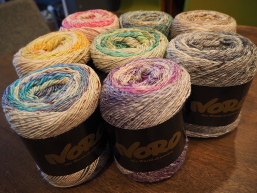 Last week Akari arrived to Wool & Grace.  This is a brand-new yarn from Noro.  It comes in ginormously round skeins – 526 yards or so – of beautiful and soft, worsted-weight yarn.  It is a blend of cotton, silk and mohair – plus a few other materials that make it easy to work with.  It’s a lot like Ito, another Noro yarn, that has been insanely popular at Wool & Grace for the past 8 months, except Akari is like it’s spring/summer-weight version.  Colors shift beautifully, as is typical for Noro yarns, but Akari tends to just change within a tonal family.  I was pretty smitten with this yarn, and upon seeing it I told Sarah (an awesome Wool & Grace instructor & employee) that I wanted to make a giant wrap-scarf-blanket with it.  With a chuckle she replied “You’re going to make a blarf!”  That alone has been enough to fuel a week’s worth of giggling and joyful knitting.  I convinced Patty that we needed a sample of Akari knit up for the shop, and I took home two balls of it to make a blarf for the shop.
