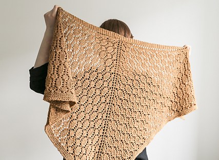 Authenticity jumps out first as a perfect yarn for Kathmandu. Three skeins will do the trick for this beautiful shawl. I particularly like that the lace motif opens up the fabric a lot, so it’s generously sized without having a ton of yardage.