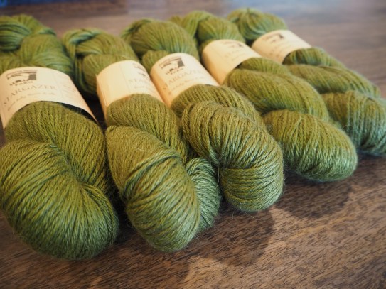 Stargazer is another gorgeous yarn that is almost gone. This camel/silk blend has sheen and drape. I have a sweater made of it with is feminine by virtue of the fiber content alone, and I’ve always imagined this would become a gorgeous shawl. Stargazer is also a dk-weight yarn that would knit up beautifully in either of the patterns mentioned above. I’m in love with this green color that reminds me of a rainy spring day.