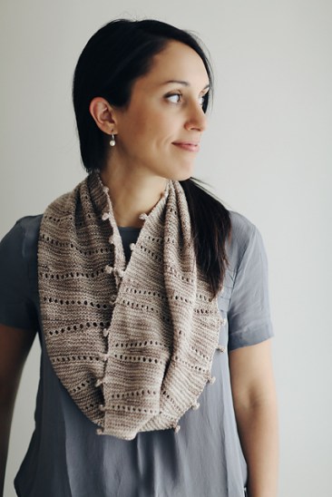 One more of Joji’s one skein wonders is the Bobble Cowl.  This is like a dainty version of the Hipster Cowl I made earlier this summer. Triangular hunks of garter stitch (shaped with easy short rows) are punctuated by little eyelets, and bobbles run along the edges.  Just. Plain. Cute.