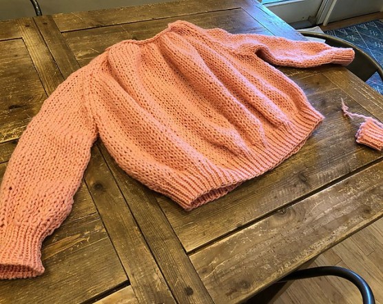 I bound off somewhat loosely for the neckline and seamed up the sleeves (not too tight on this seaming!) When I tried on the sweater I looked like a big piece of cotton candy. The sleeves were at my elbows and the yarn had a lot of loft and body – so much so that it floated around me like a cloud rather than draped.