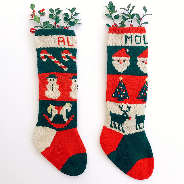 I really love the Fair Isle and Geometric Stockings by Emily Kintigh, which blend modern and traditional aesthetics in their design. The color-work motifs call upon Scandinavian textile traditions. While the patterns don’t include space for a personalization, you could easily add 1.5” of solid stockinette stitch for this. If it was me, I’d add the name via duplicate stitch when the stocking is complete. This pattern calls for a worsted weight yarn, so all those suggestions listed above are great for these stockings.