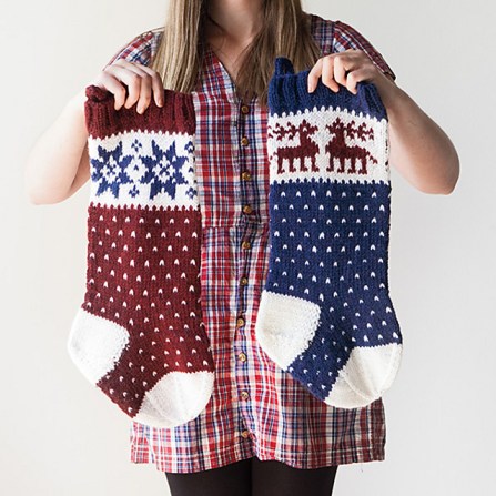 One more duo of stockings that appeals to me are the Holiday Stockings by Michelle Bernstein. I like that they’re shown in a less typical color combination, but that’s not to say you couldn’t opt for a traditional red, white and green typically used for Christmas. Bernstein uses traditional holiday motifs and straight-forward stranded color-work for stockings worked in the round. Again, these patterns aren’t shown with personalization, but they can be easily modified to include that just I described with Emily Kintigh’s patterns. Berstein’s project calls for a bulky yarn, so my two big contenders here are Cascade 128 Superwash and Brooklyn Tweed Quarry.
